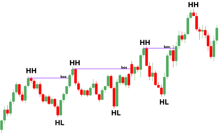 The confirmation of the Higher Low (HL) will be the Break of structure (bos) of the previous Higher High (HH). To determine the structural elements, pay attention to the swing high and low.